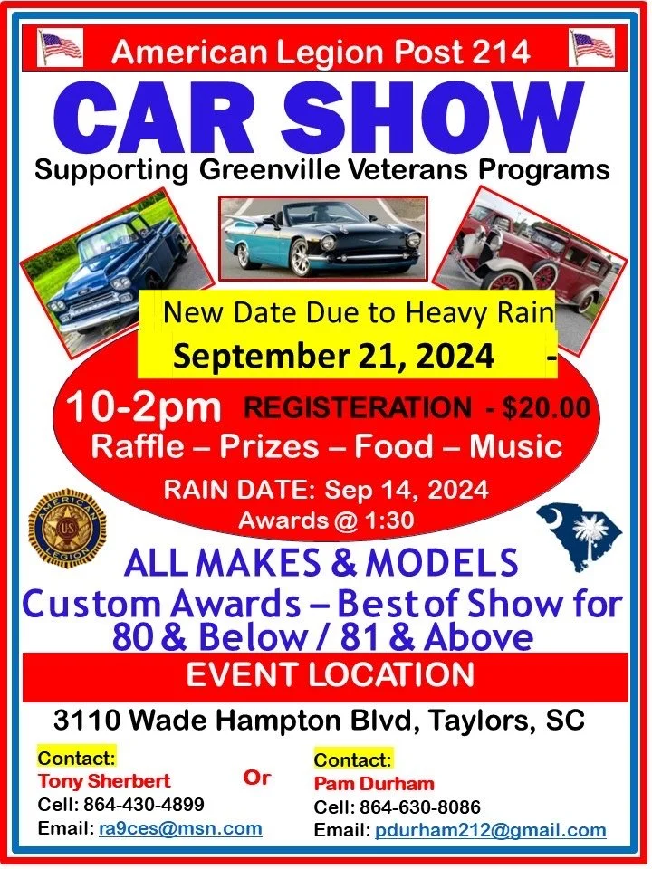 DATE CHANGE American Legion Post 214 is hosting their annual car show on Saturday September 21st from 10am-2pm at 3110 Wade Hampton Blvd, Taylors, SC 29687. Registration fee is $20 and there will be raffle prizes, food, and music. All makes and models are welcom.