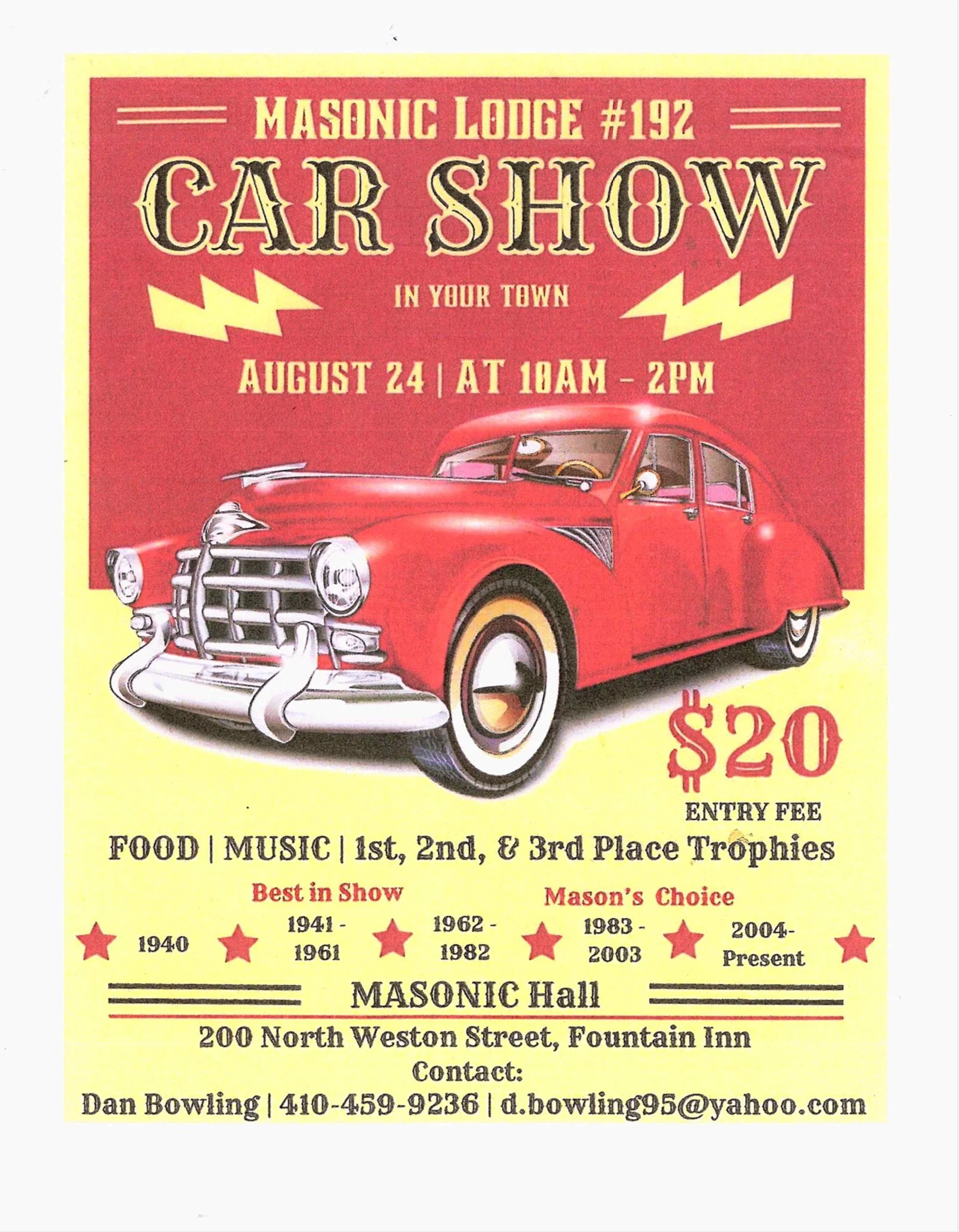 Join Lodge members as they put on a car show at their Lodge Hall. There will be food, music, and trophies for 1st, 2nd, and 3rd place entries for multiple catagories, see the flier below. $20 entry fee. Contact Dave Bowling for more information: (410)459-9236 or d.bowling95@yahoo.com.